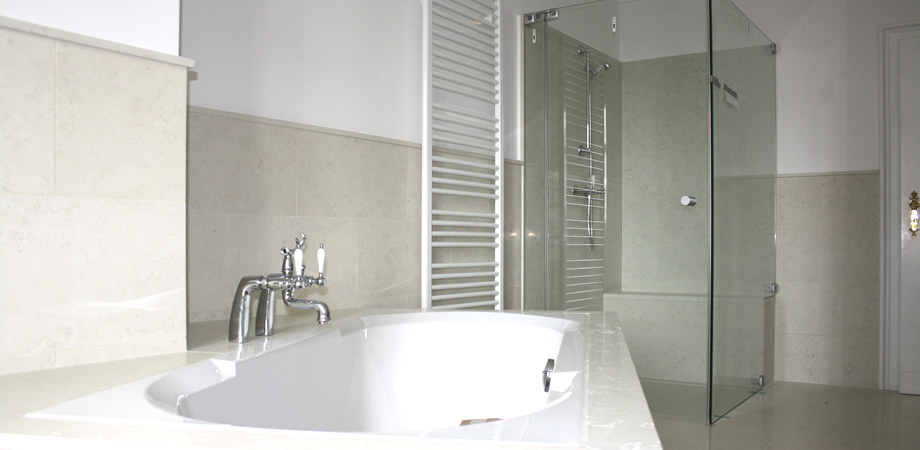 Passend zur Innenausstattung aus Naturstein fertigen wir Wandpanele, Duschwände und individuelle Wandfliesen.